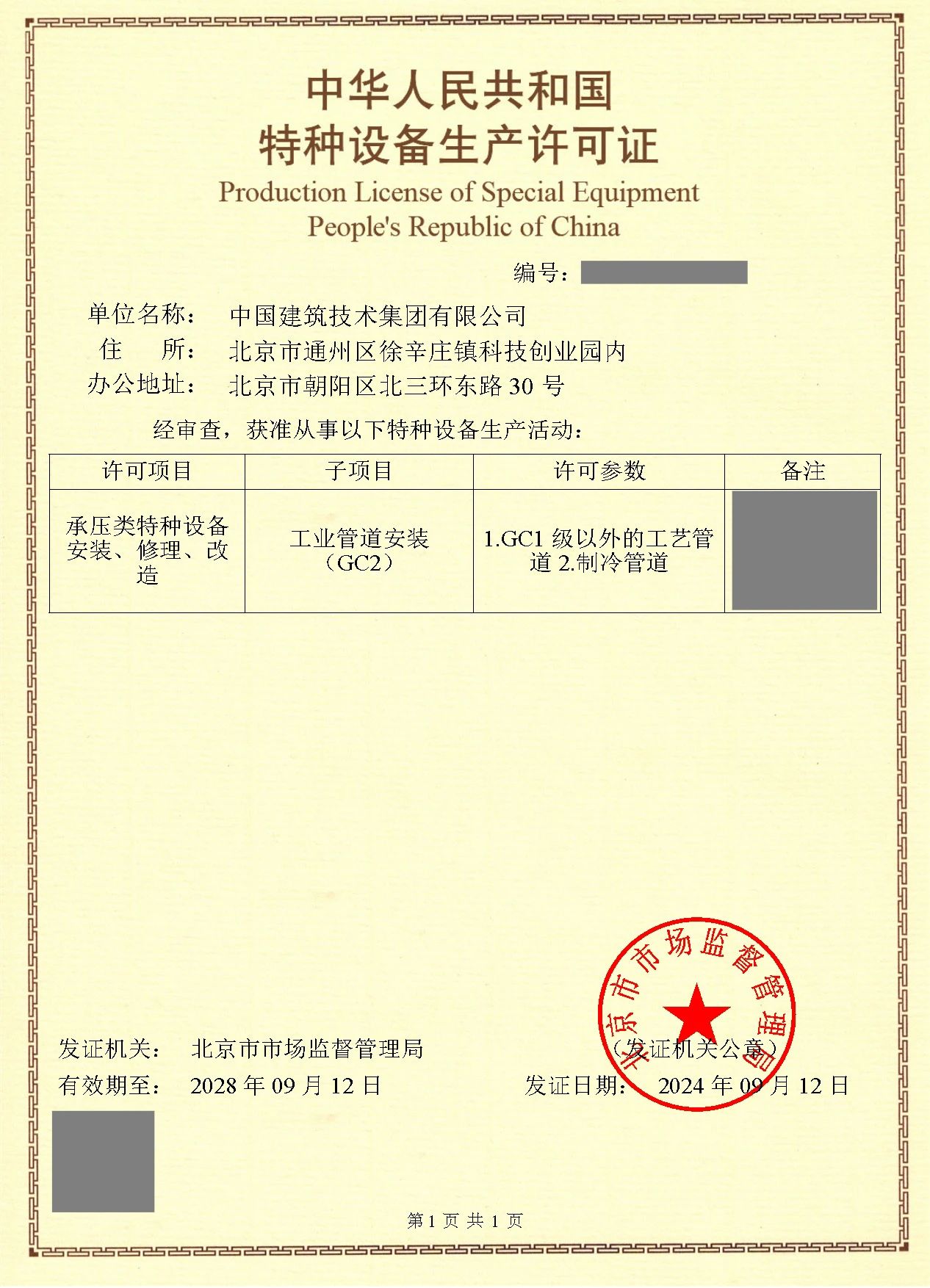 9月12日,經(jīng)北京市市場(chǎng)監(jiān)督管理局審核通過(guò),中國(guó)建技成功取得“特種設(shè)備(GC2級(jí)工業(yè)管道安裝)生產(chǎn)許可證”。工業(yè)管道安裝(GC2級(jí))生產(chǎn)許可證主要適用于承壓類特種設(shè)備的安裝、修理和改造。