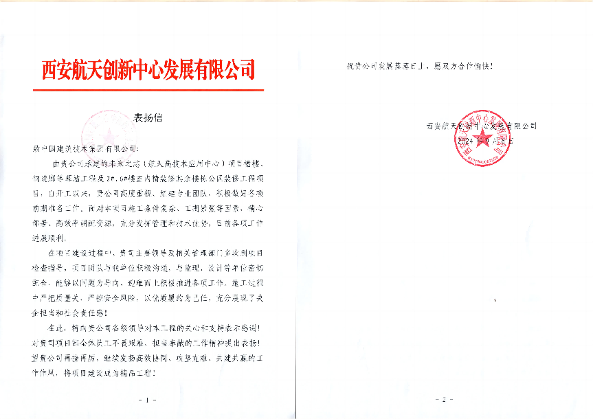 近日,西安航天創(chuàng)新中心發(fā)展有限公司向中國建技發(fā)來表揚(yáng)信,充分肯定中國建技“未來之芯”項(xiàng)目部的工作,對中國建技高質(zhì)量推進(jìn)項(xiàng)目建設(shè)、優(yōu)質(zhì)履約給予高度評價(jià)。