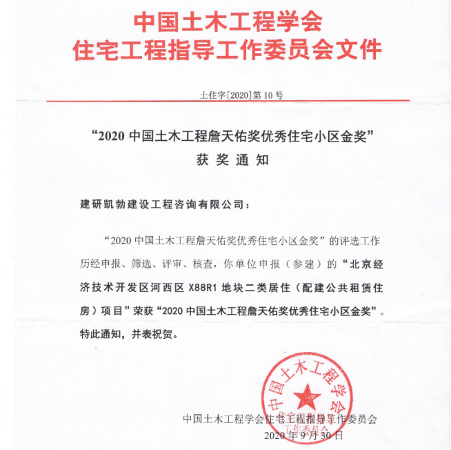建研凱勃監(jiān)理項(xiàng)目榮獲2020中國土木工程詹天佑獎(jiǎng)優(yōu)秀住宅小區(qū)金獎(jiǎng)