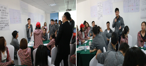 9月22日上午,在專(zhuān)業(yè)培訓(xùn)師的指導(dǎo)下,用貝爾賓團(tuán)隊(duì)角色理論測(cè)試每位員工的團(tuán)隊(duì)角色,結(jié)合該測(cè)試結(jié)果,進(jìn)行了一場(chǎng)充滿參與性、互動(dòng)性、實(shí)戰(zhàn)性、競(jìng)爭(zhēng)性的沙盤(pán)模擬訓(xùn)練。新員工們分組抽簽決定各自的所處的地形情況及資源狀況,通過(guò)小組合作產(chǎn)出產(chǎn)品并到統(tǒng)一的市場(chǎng)交易獲得效益,通過(guò)效益的多少等多重指標(biāo)衡量經(jīng)營(yíng)的整體狀況。培訓(xùn)中,小組成員充分地展示出了當(dāng)代年輕人開(kāi)闊的思維方式,會(huì)場(chǎng)熱鬧紛紛。他們思維活躍、分工有序,在充分分析內(nèi)外形勢(shì)的前提下,有效經(jīng)營(yíng),各小組均獲得了十分可觀的經(jīng)營(yíng)效果,得到了培訓(xùn)團(tuán)隊(duì)的一致好評(píng),最后每個(gè)小組的精彩自我點(diǎn)評(píng)再次將培訓(xùn)推向高潮。會(huì)后大家意猶未盡,午餐時(shí)分依然在探討思路和方法。