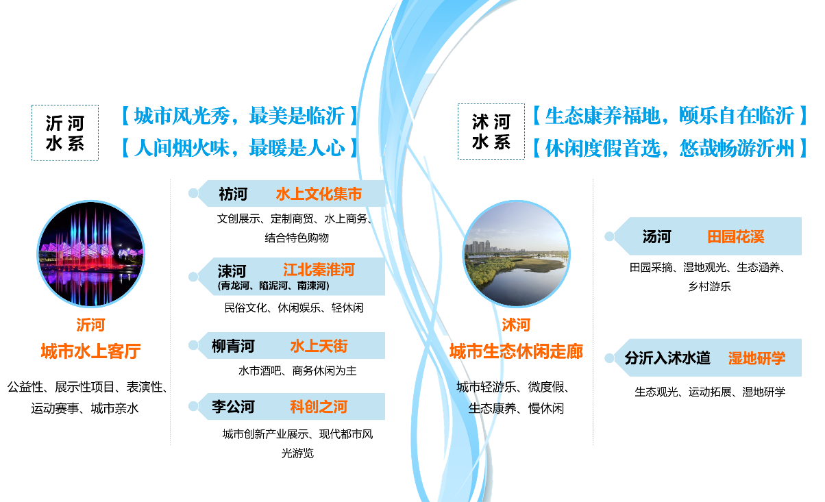 2.“水+旅游”專題——從“河流振興、因水而親、城鄉(xiāng)共榮”的角度出發(fā),通過(guò)對(duì)主要水系河流進(jìn)行發(fā)展定位,完善河流旅游產(chǎn)品和項(xiàng)目業(yè)態(tài),以主題游線設(shè)計(jì)、沂水夜游、其他特色項(xiàng)目等為吸引點(diǎn),優(yōu)化提升臨沂市水上旅游品質(zhì),樹(shù)立臨沂北方水城的品牌形象與市場(chǎng)競(jìng)爭(zhēng)力。