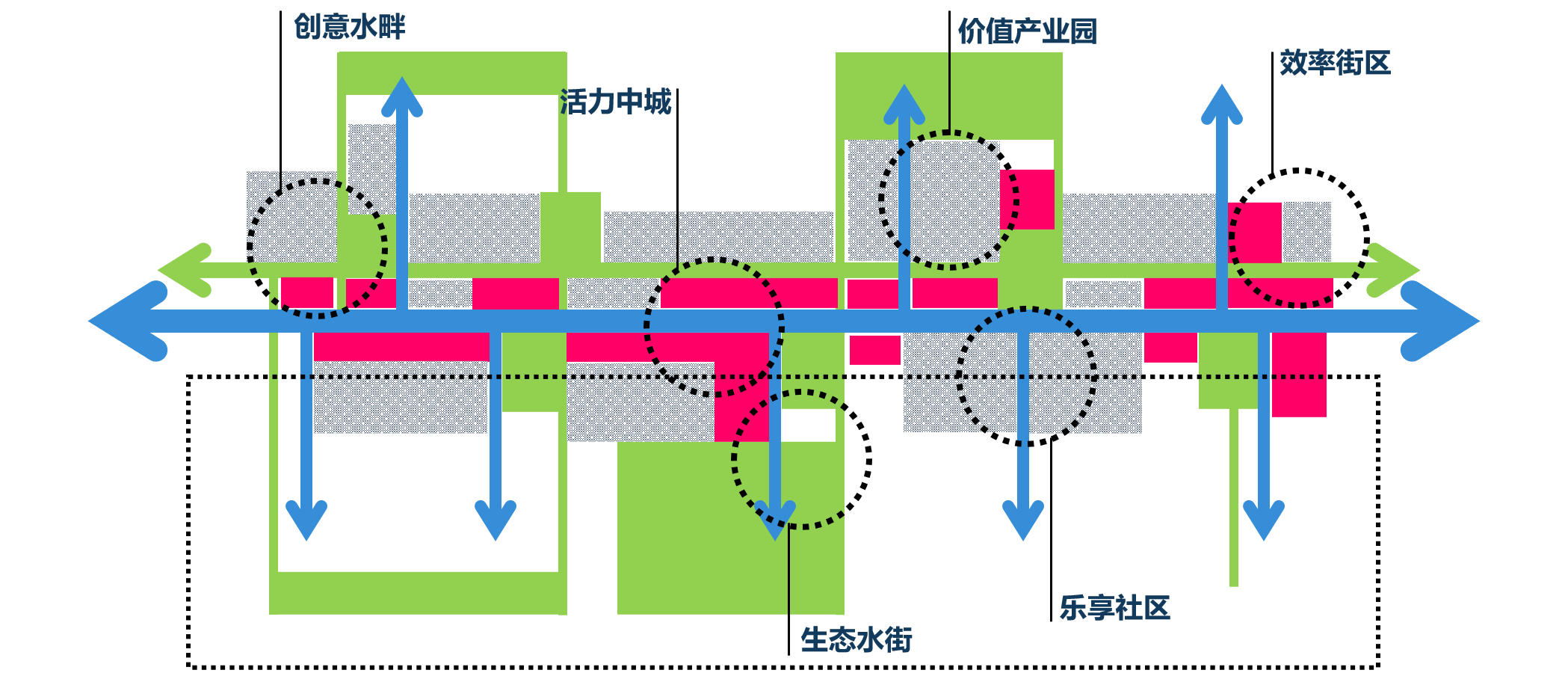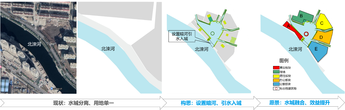 5.“水+用地”專題——針對(duì)水上項(xiàng)目周邊用地發(fā)展面臨的商業(yè)設(shè)施缺乏、用地布局單一等問(wèn)題,提出適當(dāng)增加濱河休閑商業(yè)用地、優(yōu)化土地利用布局,濱水建筑天際線控制等發(fā)展思路,真正發(fā)揮濱水用地的經(jīng)濟(jì)效益和社會(huì)價(jià)值。