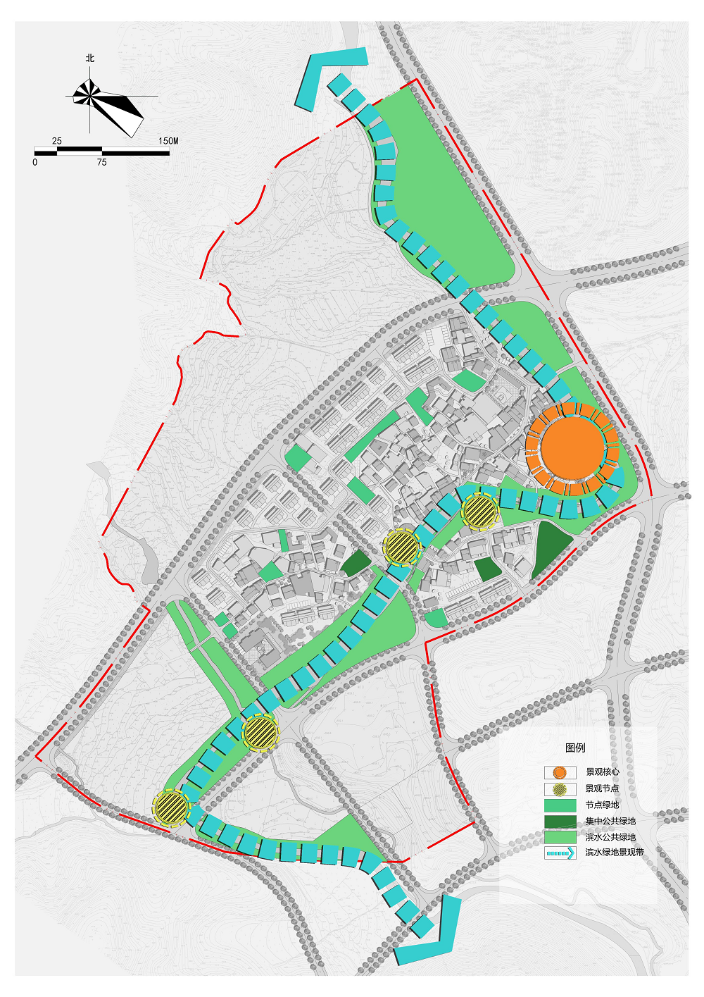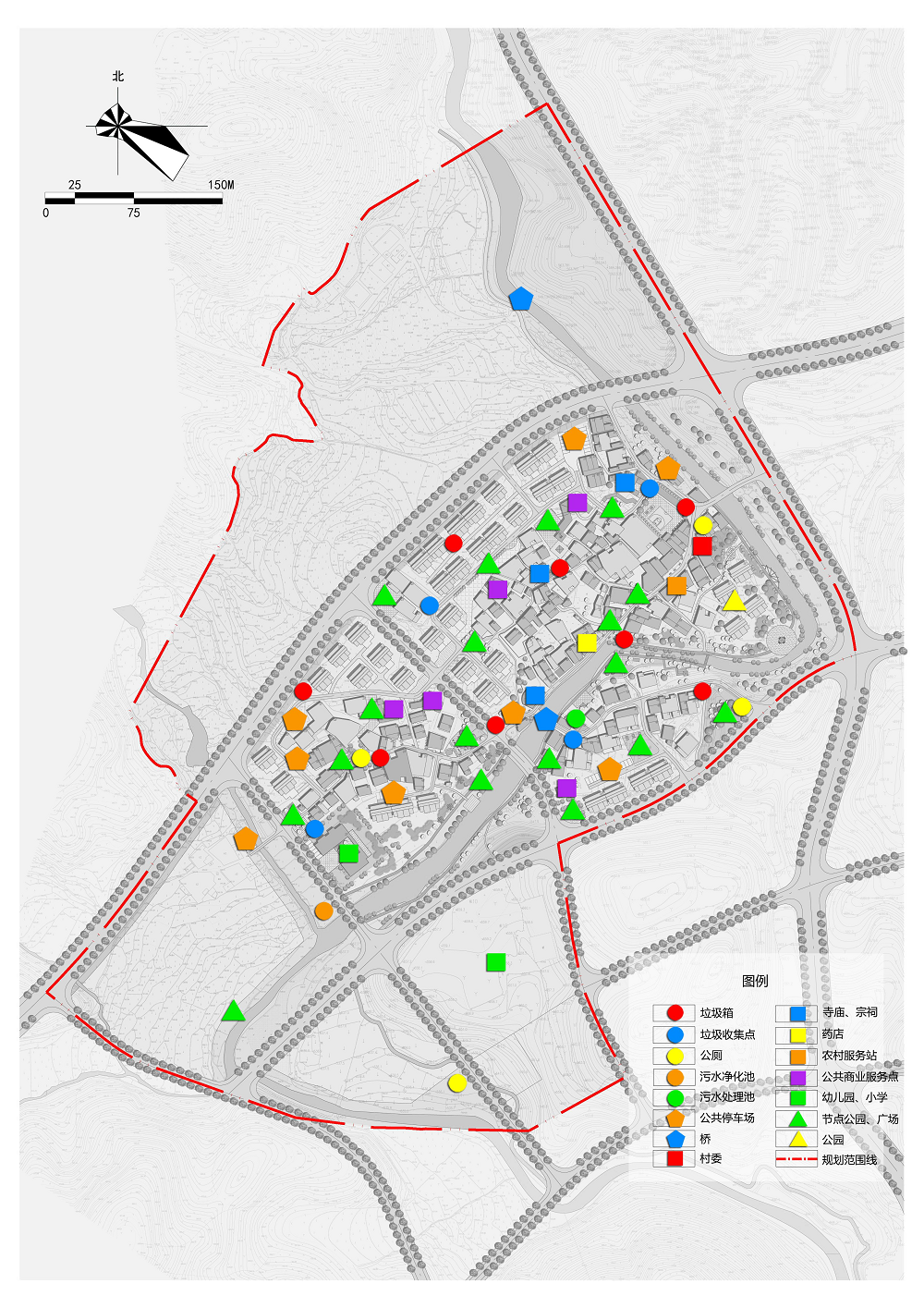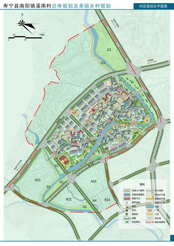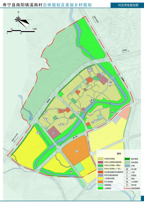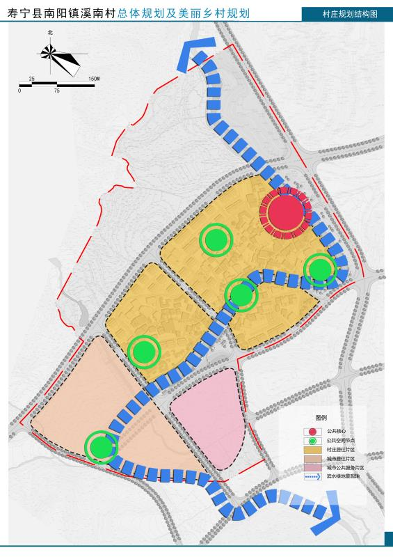 (1)結(jié)構(gòu):村莊建設(shè)發(fā)展區(qū)規(guī)劃形成“一核、一帶、五片、多點(diǎn)”——?一核:以村委、村民文化活動(dòng)公園所形成的公共核心;一帶:沿溪南村傍村而過(guò)的溪南溪所形成的濱水綠地景觀帶;五片:①依據(jù)建設(shè)情況劃分成的北部村莊居住片區(qū);②中部村莊居住片區(qū);③南部村莊居住片區(qū)與村;④西南部城市居住片區(qū);⑤城市公共服務(wù)片區(qū)