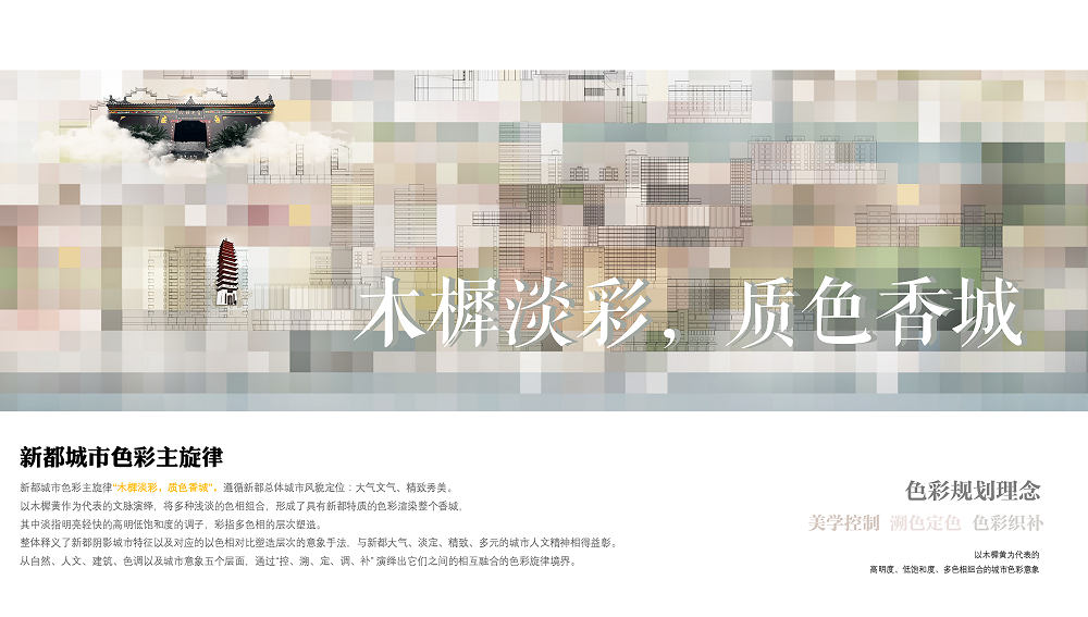 新都區(qū)城市容貌提升,是在公園城市建設(shè)背景下,追溯城市文脈、梳理城市色彩基底、尋找城市主調(diào),以城市色彩為核心,開展的系統(tǒng)性城市形象識別系統(tǒng)提升。創(chuàng)新執(zhí)行的城市色彩、戶外外擺、戶外廣告、戶外導(dǎo)視系統(tǒng),將城市以點、線、面的方式,全系統(tǒng)覆蓋,通過綜合性的治理體系及樣板段示范,建立可實施可落地的管控引導(dǎo)。