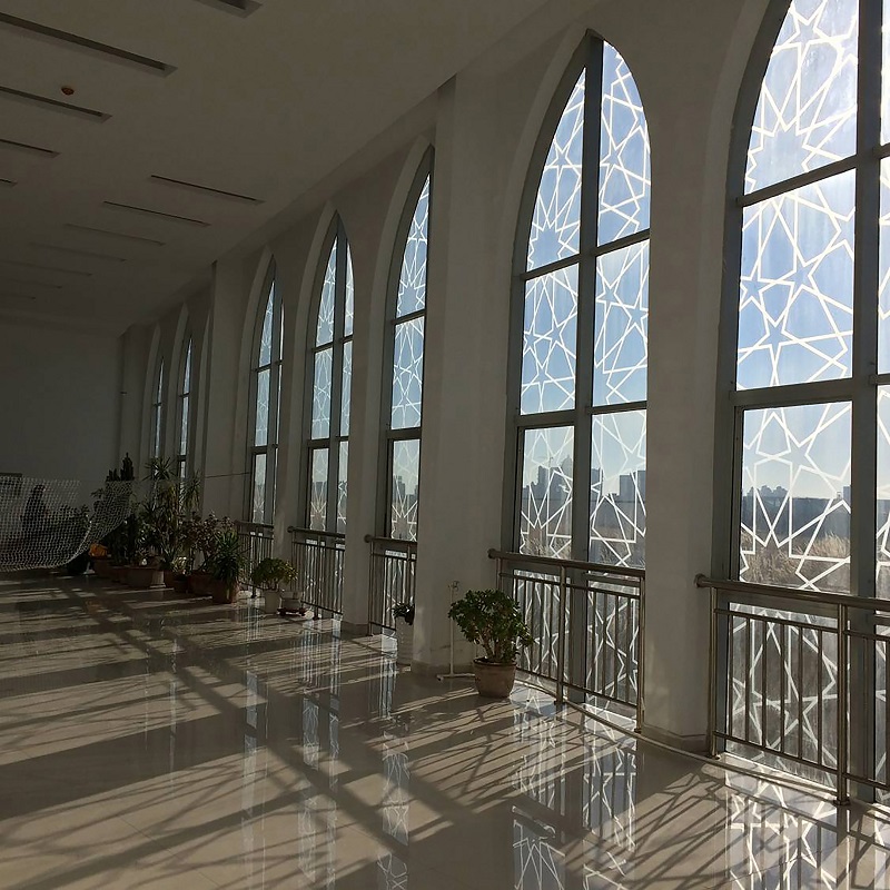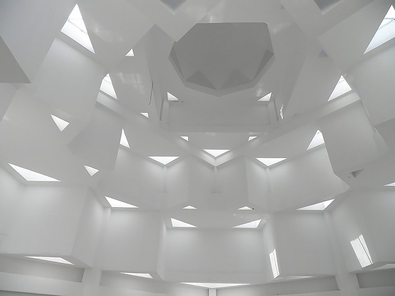 沿西北角三段式大臺階而上,可到達(dá)清真寺最重要部分的禮拜殿,也是建筑設(shè)計的“點睛”之筆:禮拜殿和穹頂?shù)脑O(shè)計,運用了同構(gòu)原理,將伊斯蘭紋樣進(jìn)行分解、變化后,生成新的幾何形體,每一層退臺與建筑形體旋轉(zhuǎn)相結(jié)合,產(chǎn)生更多、更豐富的三角形平面組合,利用這些組合,為禮拜殿上空設(shè)計了“逐層退臺”的三角形采光窗。給禮拜殿帶來了豐富的自然光源。同時,一天內(nèi)的光束變化,也將人引向一個深邃的、神圣的、崇高的精神空間。