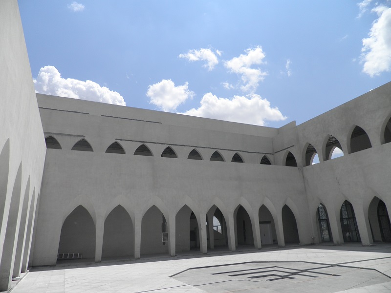 與禮拜殿相連的雙層環(huán)廊設(shè)計,通過一系列的拱形門柱,將庭院緊密環(huán)抱。門柱的拱形在延續(xù)13-15世紀(jì)建筑風(fēng)格的基礎(chǔ)上,又加以了創(chuàng)新,門拱如扭曲的柳葉,形成自然曲面,朝向庭院。潔白的環(huán)廊與麻石地面,所構(gòu)成的機理對比,給人以莊嚴(yán)、樸實的印象。37m高的宣禮塔同樣采用運用了同構(gòu)原理,將鋼結(jié)構(gòu)三棱柱體以幾何關(guān)系層層遞減,塔頂?shù)膶毱亢驮卵佬窝b飾物,與禮拜殿穹頂上的標(biāo)志遙相呼應(yīng),構(gòu)成伊斯蘭教"彎月涵星"象征。